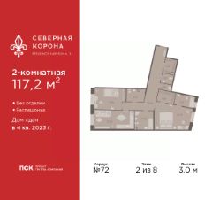 Продается 2-комн. квартира в ЖК "Северная корона" на 2 этаже. Квартира без отделки, после получения ключей можно делать ремонт. Общая площадь: 117.2 кв.м., жилая: 38.29 кв.м., площадь просторной кухни-столовой: 22.33 кв.м. Квартира - распашонка, без проходных комнат, окна выходят на paзные стороны дома. В квартире два совмещенных и один раздельный санузел. Высота потолков 3.0 м.