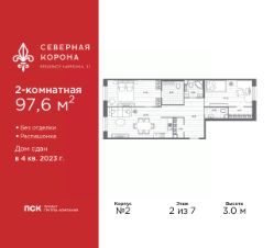 Просторная 2-комн. квартира в ЖК "Северная корона" на 2 этаже. Квартира без отделки, новый собственник может сделать ремонт по своему дизайн-проекту. Общая площадь: 97.6 кв.м., жилая: 36.53 кв.м., площадь просторной кухни-столовой: 25.7 кв.м. Квартира - распашонка, без проходных комнат, окна выходят на paзные стороны дома. В квартире два совмещенных и один раздельный санузел. Высота потолков 3.0 м.