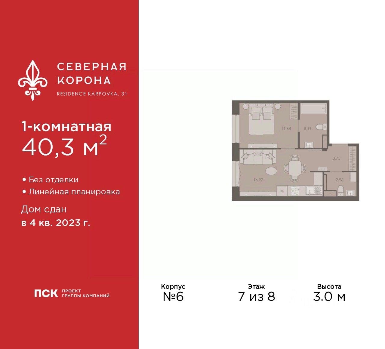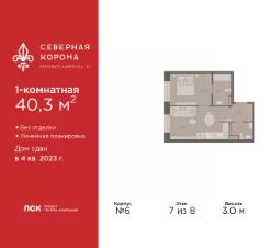 Продается 1-комн. квартира в ЖК "Северная корона" на 7 этаже. Квартира без отделки, после выдачи ключей можно делать ремонт. Общая площадь: 40.3 кв.м., жилая: 11.64 кв.м., площадь просторной кухни-столовой: 16.97 кв.м. Все окна выходят на одну сторону. В квартире один совмещенный и один раздельный санузел. Высота потолков 3.0 м.