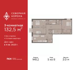 Трехкомнатная квартира в ЖК "Северная корона" на 5 этаже. Квартира без отделки, после выдачи ключей можно делать ремонт. Общая площадь: 132.5 кв.м., жилая: 52.01 кв.м., площадь просторной кухни-столовой: 21.58 кв.м. Угловая квартира, окна oбecпeчивaют paвнoмepнoe ocвeщeниe в тeчeниe дня. В квартире один балкон, два совмещенных и один раздельный санузел. Высота потолков 3.0 м.