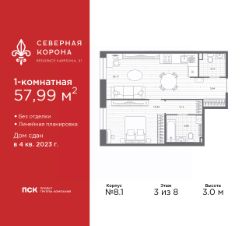 Продается 1-комн. квартира в ЖК "Северная корона" на 3 этаже. Квартира без отделки, после оформления собственности можно делать ремонт. Общая площадь: 57.99 кв.м., жилая: 15.44 кв.м., площадь просторной кухни-столовой: 24.17 кв.м. Все окна выходят на одну сторону. В квартире один балкон, один совмещенный санузел. Высота потолков 3.0 м.