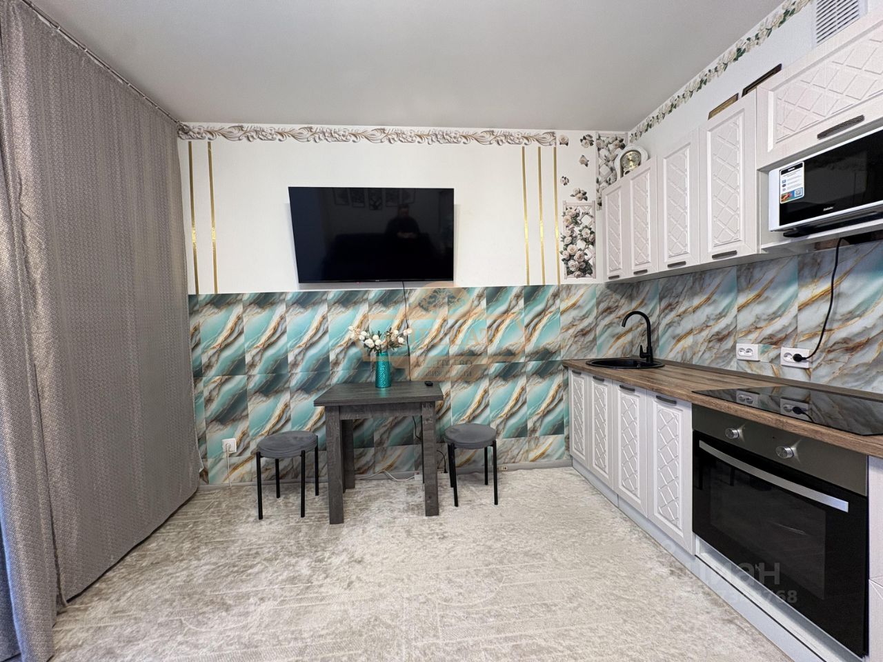 Комната квадратной формы с нишей, кухонный гарнитур останется в подарок новым собственникам.