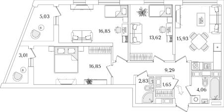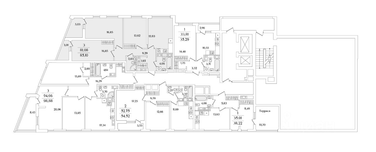 Квартира находится в 17 этажном доме, в ЛайнерЪ на 17 этаже. Общая площадь квартиры 83,60 кв.м.