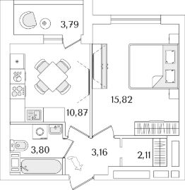 Квартира находится в 17 этажном доме, в ЛайнерЪ на 5 этаже. Общая площадь квартиры 37,60 кв.м.