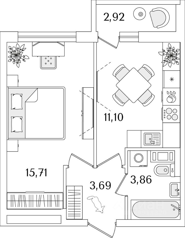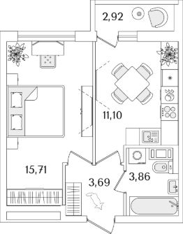 Квартира находится в 17 этажном доме, в ЛайнерЪ на 5 этаже. Общая площадь квартиры 36,10 кв.м.