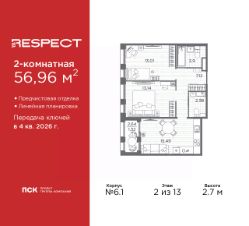 Просторная двухкомнатная квартира с предчистовой отделкой в ЖК "RESPECT" на 2 этаже. Общая площадь: 56.96 кв.м., жилая: 26.15 кв.м., площадь просторной кухни-столовой: 15.49 кв.м. Комнаты изолированные, все окна выходят на одну сторону. В квартире одна лоджия, один совмещенный и один раздельный санузел. Высота потолков 2.7 м.