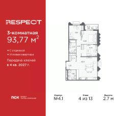 Трехкомнатная квартира от застройщика с отделкой в ЖК "RESPECT" на 4 этаже. Общая площадь: 93.77 кв.м., жилая: 37.95 кв.м., площадь просторной кухни-столовой: 29.57 кв.м. Угловая квартира, идеально подойдет любителям тишины и панорамных видов. В квартире одна лоджия, два совмещенных санузла. Высота потолков 2.7 м.