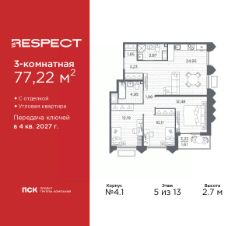 Просторная трехкомнатная квартира с отделкой в ЖК "RESPECT" на 5 этаже. Общая площадь: 77.22 кв.м., жилая: 34.78 кв.м., площадь просторной кухни-столовой: 24.95 кв.м. Квартира угловая, идеально подойдет любителям тишины и панорамных видов. В квартире одна лоджия, два совмещенных санузла. Высота потолков 2.7 м.