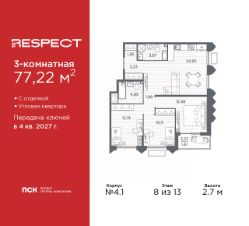 3-комн. квартира с отделкой в ЖК "RESPECT" на 8 этаже. Общая площадь: 77.22 кв.м., жилая: 34.78 кв.м., площадь просторной кухни-столовой: 24.95 кв.м. Квартира угловая, идеально подойдет любителям тишины и панорамных видов. В квартире одна лоджия, два совмещенных санузла. Высота потолков 2.7 м.