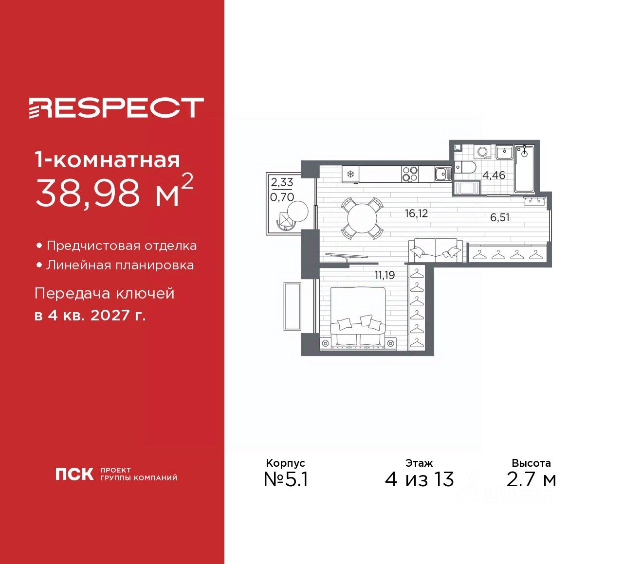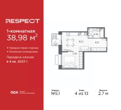 1-комн. квартира от застройщика с предчистовой отделкой в ЖК "RESPECT" на 4 этаже. Общая площадь: 38.98 кв.м., жилая: 11.19 кв.м., площадь просторной кухни-столовой: 16.12 кв.м. Все окна выходят на одну сторону. В квартире один балкон, один совмещенный санузел. Высота потолков 2.7 м.