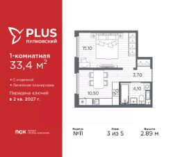 1-комн. квартира от застройщика с отделкой в ЖК "PLUS Пулковский" на 3 этаже. Общая площадь: 33.4 кв.м., жилая: 15.1 кв.м., площадь просторной кухни-столовой: 10.5 кв.м. Все окна выходят на одну сторону. В квартире один совмещенный санузел. Высота потолков 2.89 м.