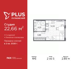 Продается 1-комн. квартира-студия с отделкой в ЖК "PLUS Пулковский" на 2 этаже. Общая площадь: 22.66 кв.м., площадь гостиной 14.55 кв.м., из которых 5 кв.м. выделено под кухонную зону. Все окна выходят на одну сторону. В квартире один совмещенный санузел. Высота потолков 2.89 м.
