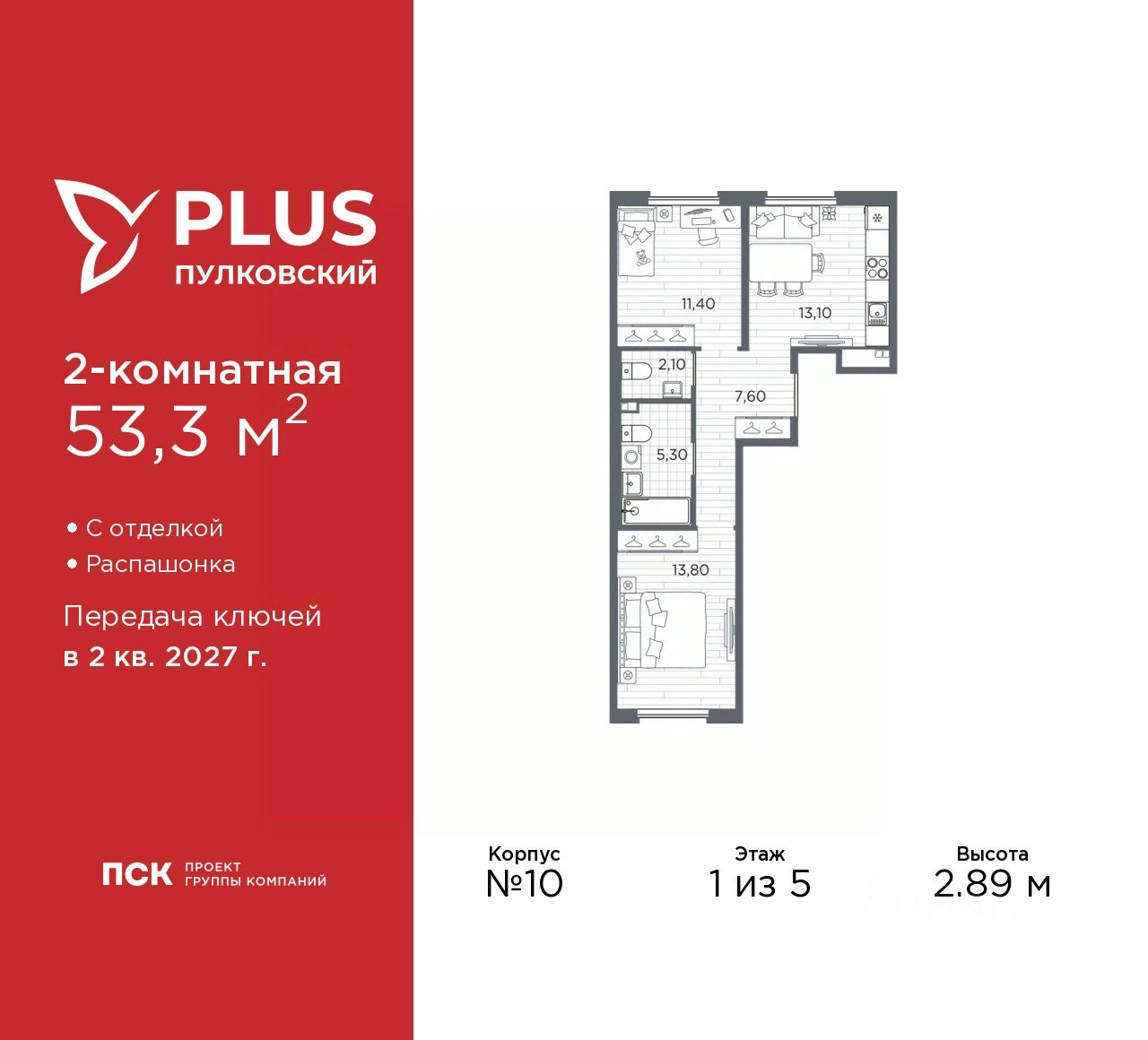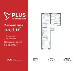 Продается 2-комн. квартира с отделкой в ЖК "PLUS Пулковский" на 1 этаже. Общая площадь: 53.3 кв.м., жилая: 25.2 кв.м., площадь просторной кухни-столовой: 13.1 кв.м. Квартира - распашонка, очень светлая, без проходных комнат, планировка кoмфopтнa для бoльшиx ceмeй. В квартире один совмещенный и один раздельный санузел. Высота потолков 2.89 м.