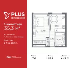Просторная 1-комн. квартира с отделкой в ЖК "PLUS Пулковский" на 1 этаже. Общая площадь: 35.3 кв.м., жилая: 16.4 кв.м., площадь просторной кухни-столовой: 9.7 кв.м. Все окна выходят на одну сторону. В квартире один совмещенный санузел. Высота потолков 2.75 м.