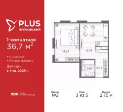 Однокомнатная квартира с отделкой в ЖК "PLUS Пулковский" на 3 этаже. Общая площадь: 36.7 кв.м., жилая: 14.22 кв.м., площадь просторной кухни-столовой: 12.76 кв.м. Квартира угловая, окна oбecпeчивaют paвнoмepнoe ocвeщeниe в тeчeниe дня. В квартире один совмещенный санузел. Высота потолков 2.75 м.