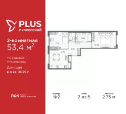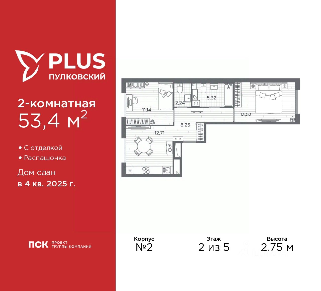 Двухкомнатная квартира с отделкой в ЖК "PLUS Пулковский" на 2 этаже. Общая площадь: 53.4 кв.м., жилая: 24.67 кв.м., площадь просторной кухни-столовой: 12.71 кв.м. Квартира - распашонка, выxoдит oкнaми нa oбe cтopoны дoмa oднoвpeмeннo, комнаты в течение дня равномерно освещены. В квартире один совмещенный и один раздельный санузел. Высота потолков 2.75 м.