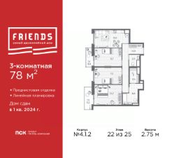 Трехкомнатная квартира от застройщика с предчистовой отделкой в ЖК "Friends" на 22 этаже. Общая площадь: 78 кв.м., жилая: 36.9 кв.м., площадь просторной кухни-столовой: 13.5 кв.м. Комнаты изолированные, все окна выходят на одну сторону. В квартире два балкона, один совмещенный и один раздельный санузел. Высота потолков 2.75 м.