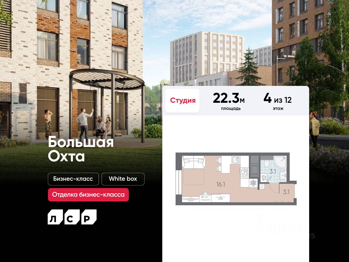 "ЛСР. Большая Охта" - проект бизнес-класса, в Красногвардейском районе между Якорной и Партизанской улицами, рядом с центром Петербурга. Престижный комплекс с удобной пешеходной и транспортной доступностью. Особенности квартиры высокие потолки и увеличенные окна.