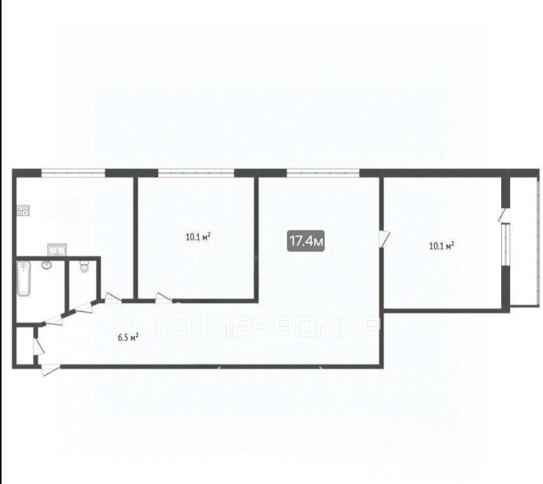 Планировка: изолированная комната 10 кв.м., комнаты 17,4 кв.м. +10.1 кв.м. смежные. Кухня 6 кв.м и открытая лоджия 3 кв.м., раздельный санузел. В квартире имеется встроенный шкаф ( кладовка) во входной зоне.