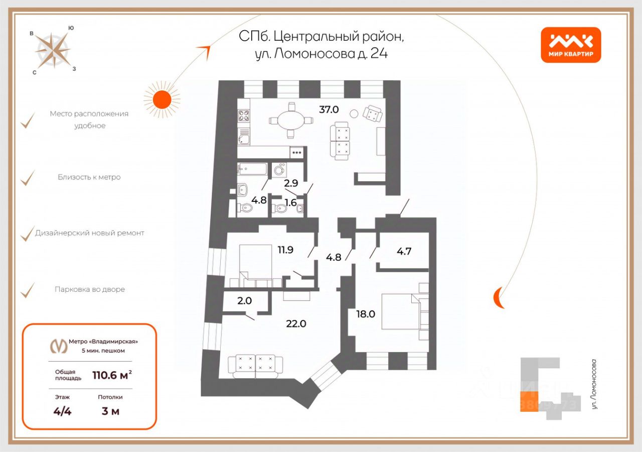 Квартира 3-х комнатная, общей площадью 110.6 кв.м.
