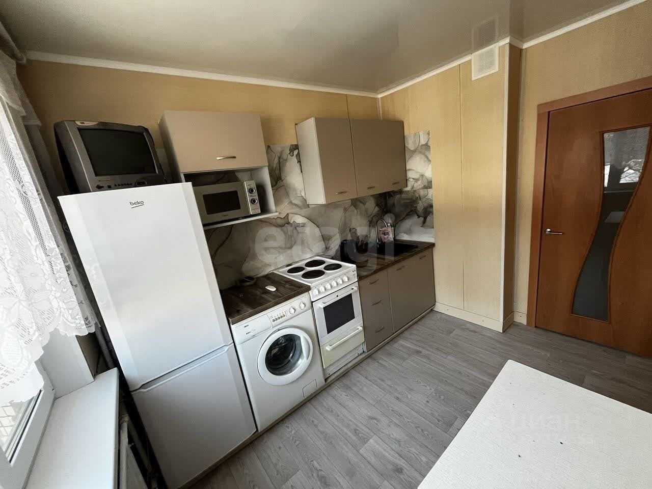 Кухня оборудована необходимой техникой, включая холодильник и стиральную машину.