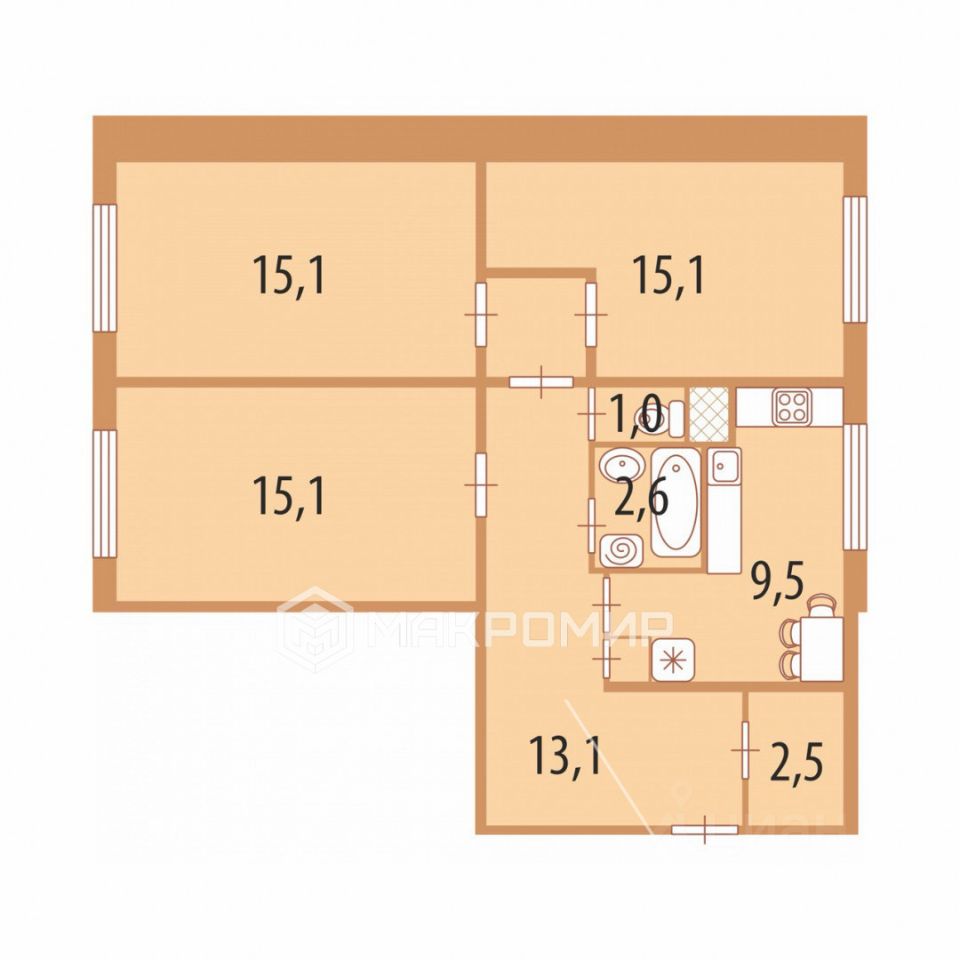 - просторные изолированные комнаты по 15,1 кв.м.