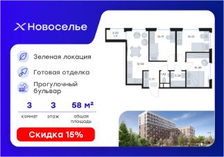 Продаётся 3-комнатная квартира в строящемся доме (Дом 3), срок сдачи: IV-кв. 2026, общей площадью 58.27 кв.м., на 3 этаже. GloraX Новоселье - новый проект комфорт-класса на юго-западной границе Санкт-Петербурга и Ленинградской области. Близость к зеленым зонам Гореловского лесопарка и природного Шунгеровского заказника, а также пешеходный многофункциональный бульвар в центре квартала - идеальное место для тех, кто ценит природу и тишину, при этом не готов отказываться от благ современной инфраструктуры.