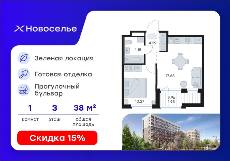 Продаётся 1-комнатная квартира в строящемся доме (Дом 3), срок сдачи: IV-кв. 2026, общей площадью 38.4 кв.м., на 3 этаже. GloraX Новоселье - новый проект комфорт-класса на юго-западной границе Санкт-Петербурга и Ленинградской области. Близость к зеленым зонам Гореловского лесопарка и природного Шунгеровского заказника, а также пешеходный многофункциональный бульвар в центре квартала - идеальное место для тех, кто ценит природу и тишину, при этом не готов отказываться от благ современной инфраструктуры.