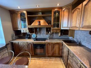 Кухня Италия, массив дуба, витражные стекла, техника пр-ва Германии: плита AEG Competence, 40 функций, холодильник AEG, посудомойка AEG, мойка финская, мельница под мойкой, США. Ванная: ванна (оригинал)Джакузи Джейша с медицинским массажем, позолота 24 карата, унитаз, шкафчик с позолотой (Gollywood), всё пр-во Италии.