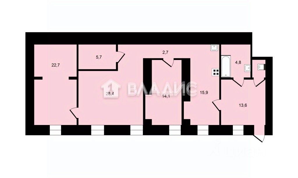 Жилая площадь - 62,2 кв.м (14,1+ 28,4+ 22,7)