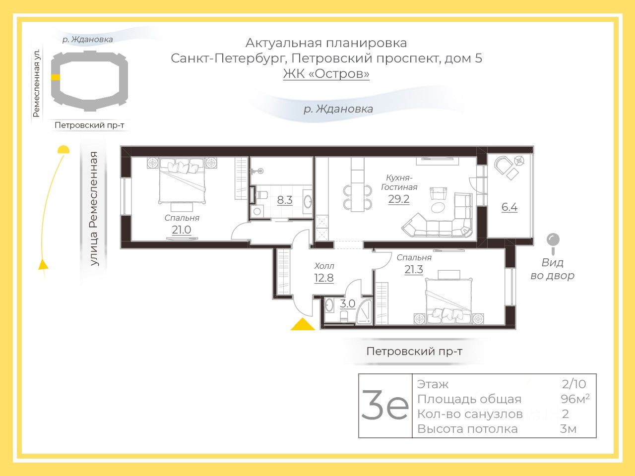 Две спальни: 21 + 21 кв. м. Одна из них - мастер спальня с большим санузлом площадью 8,4 кв.м.