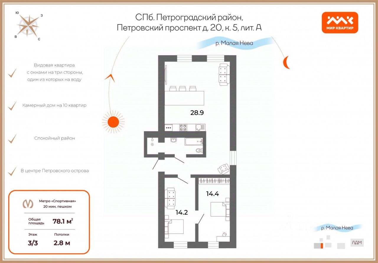 Арт. 132217984 Последний этаж в историческом доме с панорамой воды — полная приватность и атмосфера спокойствия в центре Петроградской стороны. ЛОКАЦИЯ Представьте, что каждое утро вы открываете окно и видите тихую воду Малой Невки, а городская суета остаётся за стенами дома. Петровский проспект — одна из самых закрытых и редких локаций Петроградской стороны. Здесь нет туристического шума, транзитных потоков и плотной застройки — только вода, воздух и ощущение приватности. Дом расположен прямо на берегу Малой Невки: прогулки вдоль воды начинаются от парадной, а до ЗСД — всего несколько минут без пробок. Крестовский остров, Васильевский и исторический центр города — рядом, но без ощущения "жизни на дороге". Такие адреса не масштабируются. Их просто больше не появляется — это штучный шанс жить у воды в историческом Петербурге. ДОМ Кирпичный дом 1917 года — эпоха, когда строили не "метры", а качество, пропорции и долговечность. Трёхэтажный, двухпарадный, без лифтов и коммерческих помещений, дом создаёт спокойную, камерную атмосферу без случайных людей. Конструктив дома в хорошем состоянии, проводились работы по кровле и ремонту конструкций. Это не "парадный фасад для показухи", а тихий статусный дом для своих, который ценят за атмосферу и приватность. Исторические дома с расположением у воды — штучный продукт, особенно на Петроградской стороне. КВАРТИРА Последний этаж, без соседей сверху — полное ощущение личного пространства. Светлая, тёплая и тихая: окна выходят во двор и на воду, без шума магистралей. Особенности квартиры: Общая площадь 78 м², жилая — 29 м² Две изолированные комнаты (14,2 и 14,4 м²) Просторная кухня-гостиная 28,9 м² с натуральным испанским белым мраморным островом Итальянская кухня с встроенной техникой и телевизором Совмещённый санузел, евроремонт, центральное отопление Высокие потолки и грамотная планировка создают ощущение воздуха и свободы — квартира воспринимается гораздо просторнее, чем её метраж. Это вариант для тех, кто хочет заехать и жить сразу, без переделок и ожиданий. УСЛОВИЯ СДЕЛКИ Один взрослый собственник. Прозрачная история владения, без сложных схем. Быстрый выход на сделку. Предлагаем ПРЕМИАЛЬНОЕ обслуживание для требовательных клиентов. Оперативно организуем просмотр, предоставим полную информацию по объекту. 20 лет работы с требовательными клиентами подготовили нас к решению ВАШИХ сложных задач. Будем рады знакомству! Ул. Рубинштейна, д.8.