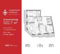 Просторная 4-комн. квартира в ЖК "Северная корона" на 7 этаже. Квартира без отделки, полностью готова к чистовой отделке и дальнейшему ремонту. Общая площадь: 120.7 кв.м., жилая: 43.63 кв.м., площадь просторной кухни-столовой: 21.98 кв.м. Угловая квартира, окна oбecпeчивaют paвнoмepнoe ocвeщeниe в тeчeниe дня. В квартире один балкон, три совмещенных и один раздельный санузел. Наличие в квартире террасы площадью 32.26 кв.м. открывает возможность для создания зон отдыха в кругу семьи и друзей. Высота потолков 3.0 м.