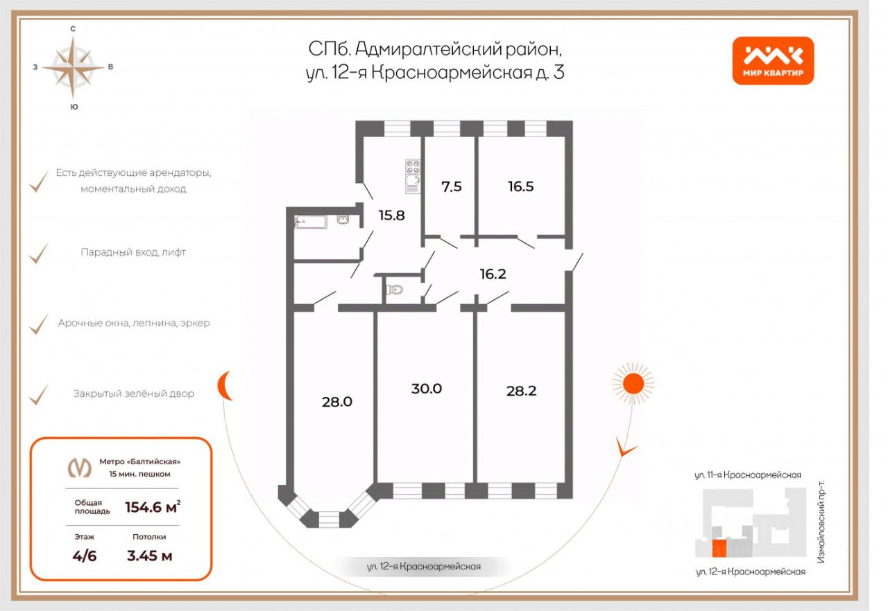 Арт. 132106039 Просторная, фасадная квартира с эркером и лепниной на тихой 12-ой Красноармейской в доме с новым лифтом и огромными арочными окнами.