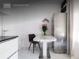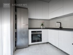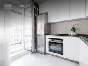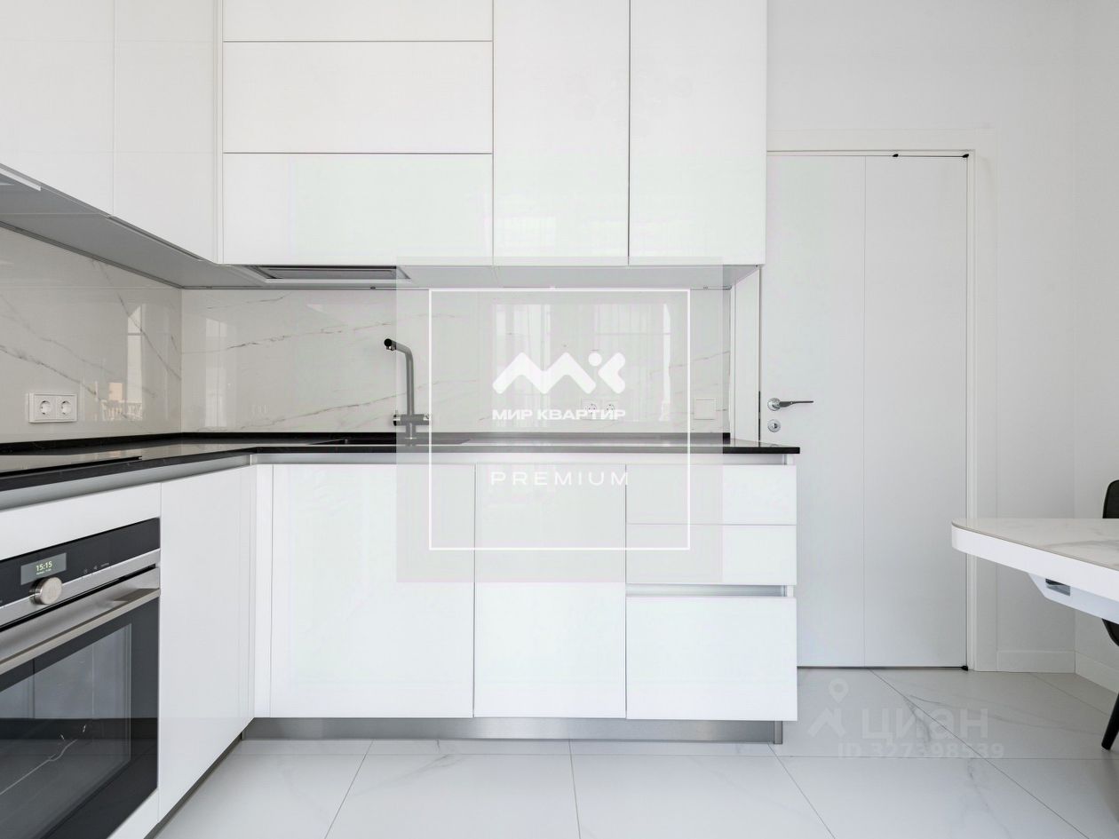 На кухне расположен гарнитур с белыми глянцевыми фасадами, столешницей из камня и встроенной техникой премиум-класса.