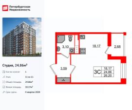 Удобная, классическая, функциональная европланировка, просторная прихожая 3.59 м². Общая площадь студии - 24.86 м², жилая 18.17 м², высота потолка 3 м.