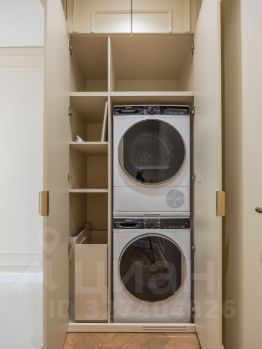 Продумана в квартире постирочная зона для этого отведен отдельный шкаф, где размещена колонна стиральной и сушильной машин компании smeg, отведено место для всей бытовой химии и корзины для белья