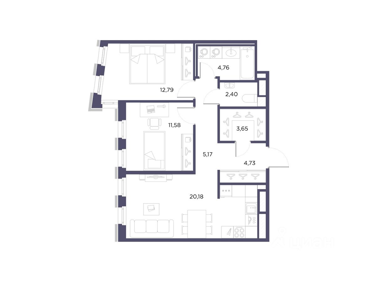 2-комн. квартира от застройщика с предчистовой отделкой в ЖК "Лисичанская, 22" на 2 этаже. Общая площадь: 65.26 кв.м., жилая: 24.37 кв.м., площадь просторной кухни-столовой: 20.18 кв.м. Комнаты изолированные, все окна выходят на одну сторону. В квартире один раздельный санузел. Высота потолков 2.7 м.