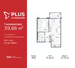 1-комн. квартира с отделкой в ЖК "PLUS Пулковский" на 3 этаже. Общая площадь: 39.88 кв.м., жилая: 10.03 кв.м., площадь просторной кухни-столовой: 20.76 кв.м. Все окна выходят на одну сторону. В квартире один балкон, один совмещенный санузел. Высота потолков 2.75 м.