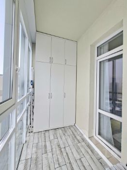 На лоджии,помимо нового остекленения, есть встроенный шкаф.
