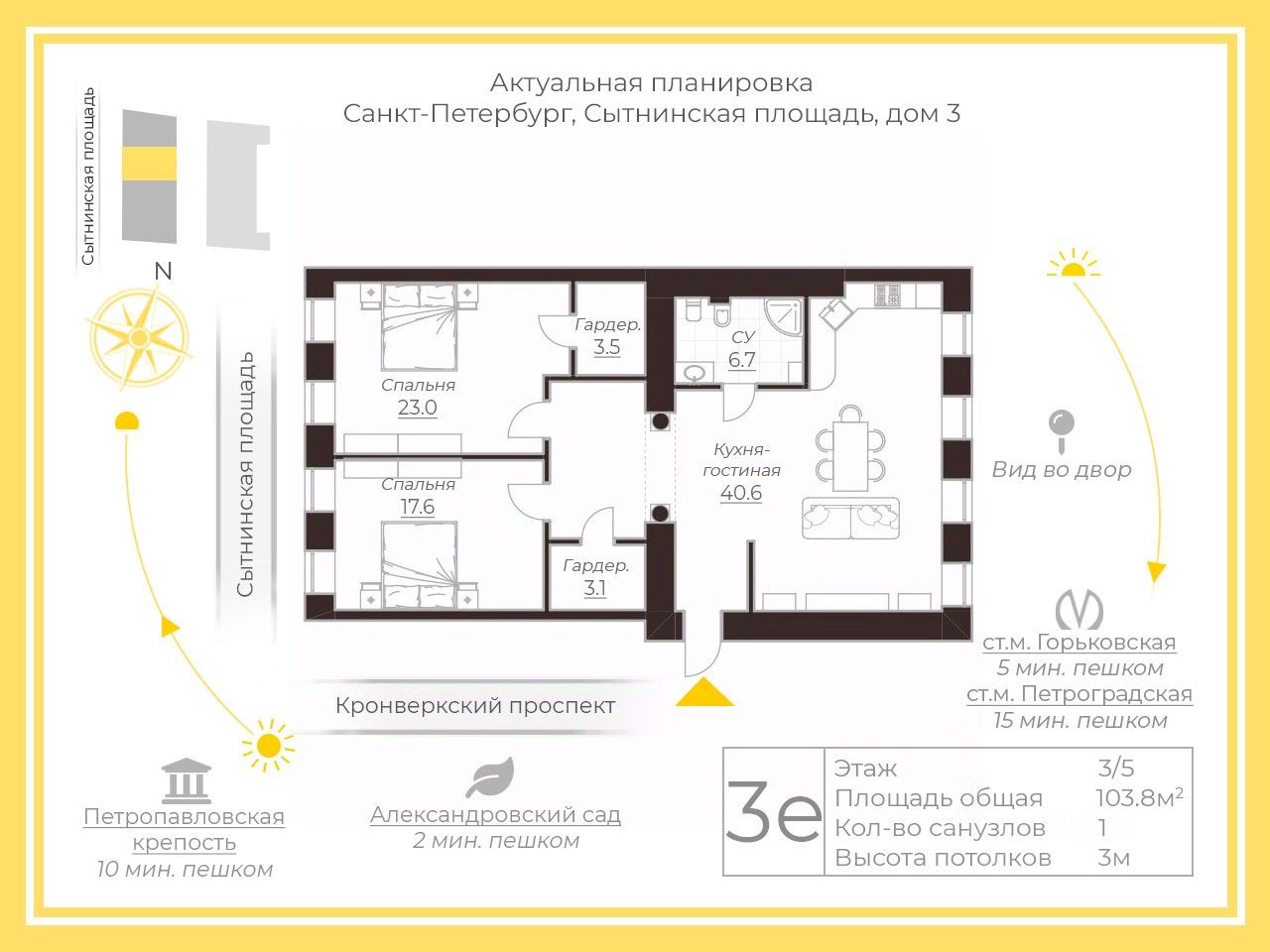 Всего в паре минут неспешной прогулки зелень Александровского парка (3 мин.), Матвеевского сада (7 мин.), величество Петропавловской крепости и гладь Невы (20 мин.). Магазины, школы, детские сады и вся инфраструктура в пешей доступности!