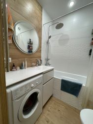 - Ванная комната 3,4 кв.м. - установлена качественная сантехника, оснащена всей необходимой мебелью, акриловая ванна, подвесной унитаз с инсталяцией, раковина с литой столешницей под стиральную машину, зеркало с подсветкой, эл. полотенцесушитель. Теплые полы в ванной комнате.