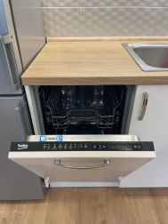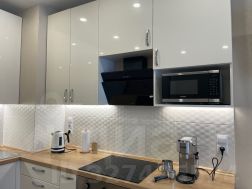 - Качественная кухня-гостиная с продуманным дизайном и встроенной техникой: варочная индукционная плита, духовой шкаф, посудомоечная машина, вытяжка, большой вместительный холодильник. Мебель: обеденный стол со стульями, угловой диван со спальным местом для каждодневного использования, большой 3-х створчатый шкаф.