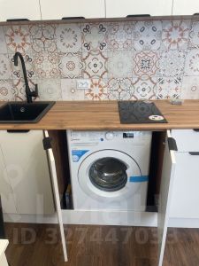 Комната - 12,5 кв.м.- встроенная кухня, варочная поверхность , стиральная машина, холодильник, диван-кровать, шкаф.