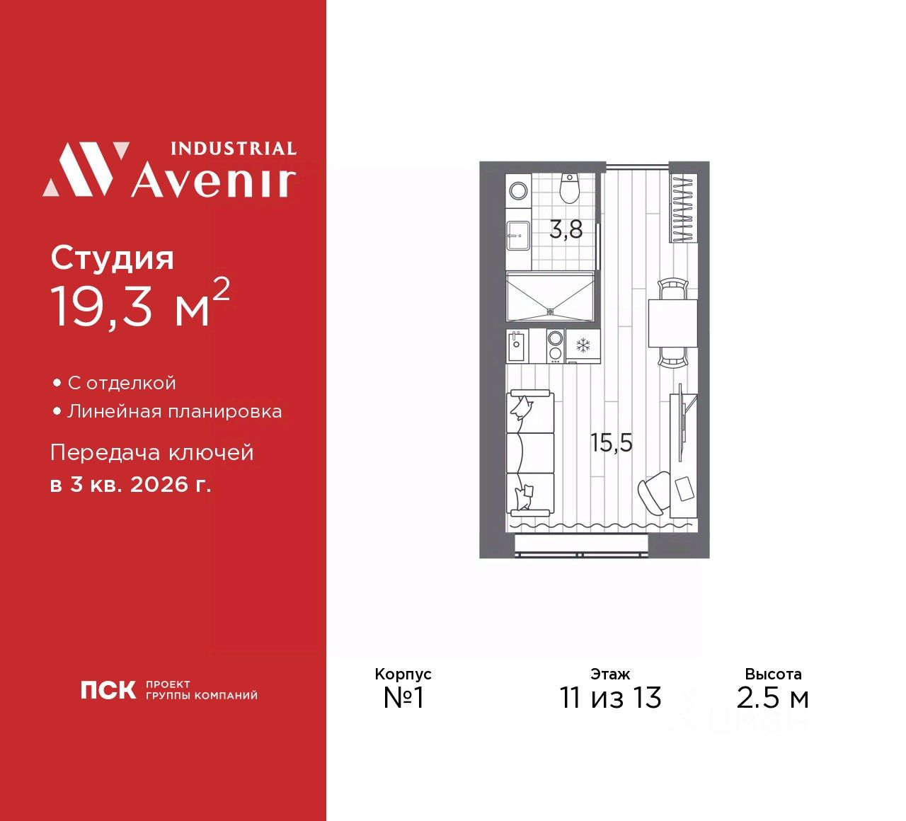 1-комн. апартаменты-студия от застройщика с отделкой в ЖК "Industrial AVENIR" на 11 этаже. Общая площадь: 19.3 кв.м., площадь гостиной 15.5 кв.м., из которых 5 кв.м. выделено под кухонную зону. Все окна выходят на одну сторону. В апартаментах один совмещенный санузел. Высота потолков 2.5 м.