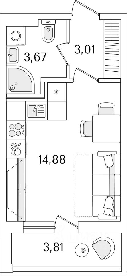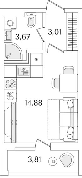 Квартира находится в 17 этажном доме, в ЛайнерЪ на 2 этаже. Общая площадь квартиры 22,90 кв.м.