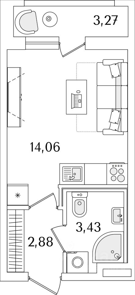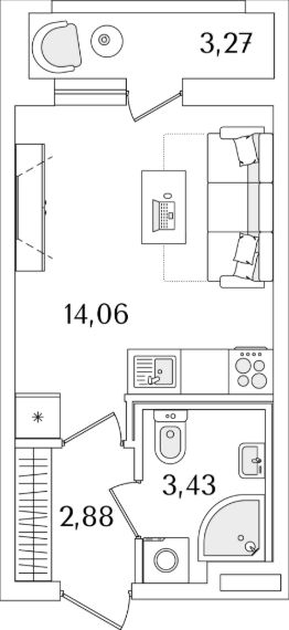 Квартира находится в 17 этажном доме, в ЛайнерЪ на 2 этаже. Общая площадь квартиры 21,60 кв.м.