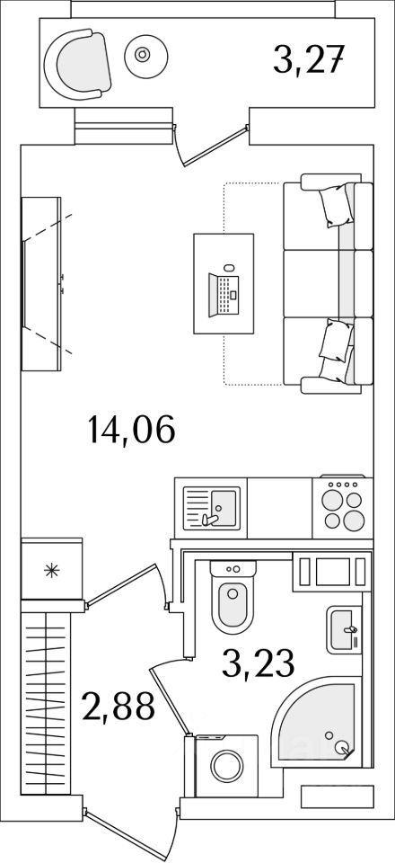 Квартира находится в 17 этажном доме, в ЛайнерЪ на 5 этаже. Общая площадь квартиры 21,40 кв.м.