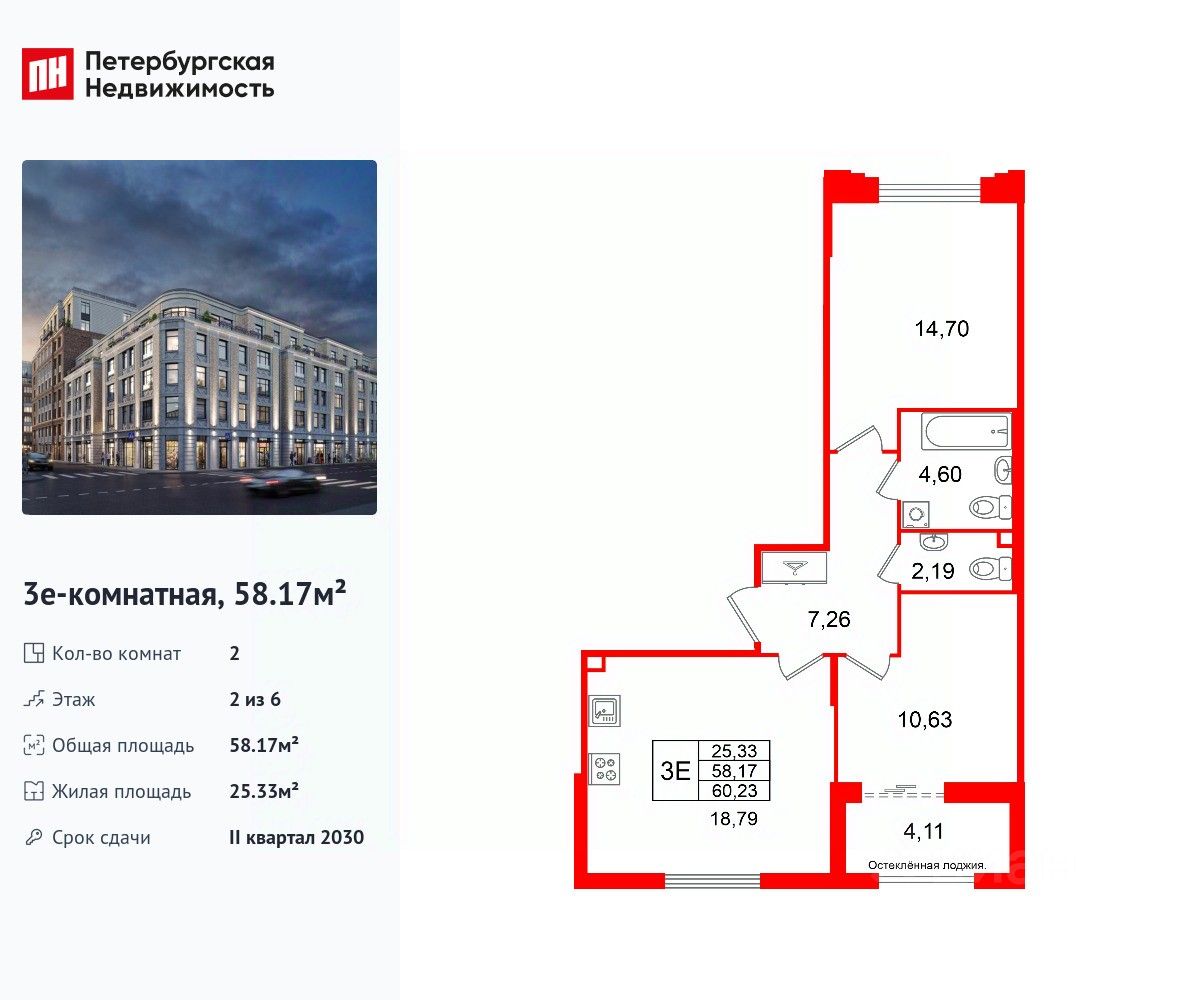 Удобная, классическая, функциональная европланировка, большая кухня-гостиная 18.79 м², вместительная прихожая 7.26 м². Общая площадь квартиры - 58.17 м², жилая 25.33 м², высота потолка 3 м.