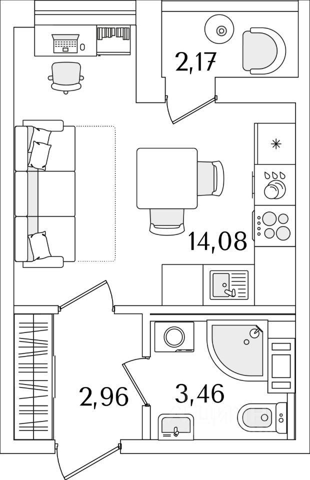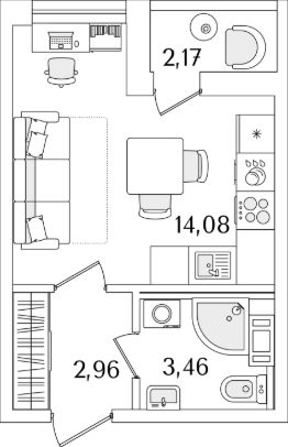 Квартира находится в 17 этажном доме, в ЛайнерЪ на 7 этаже. Общая площадь квартиры 21,30 кв.м.